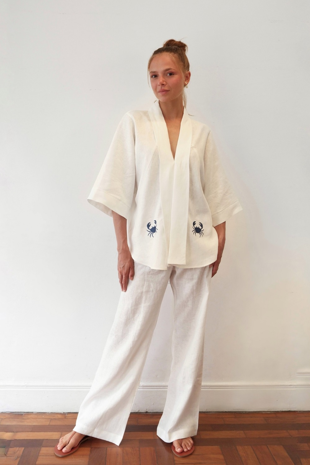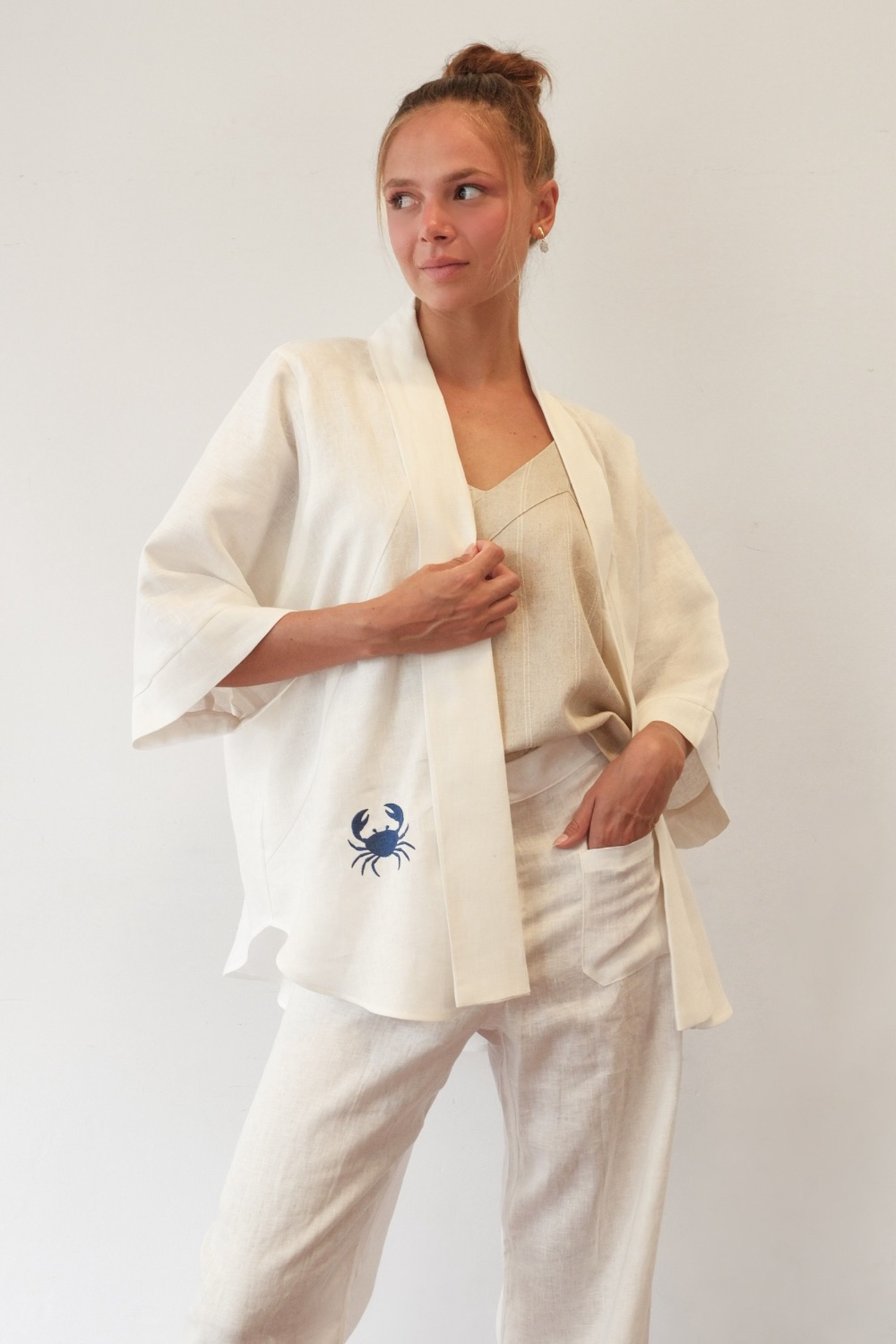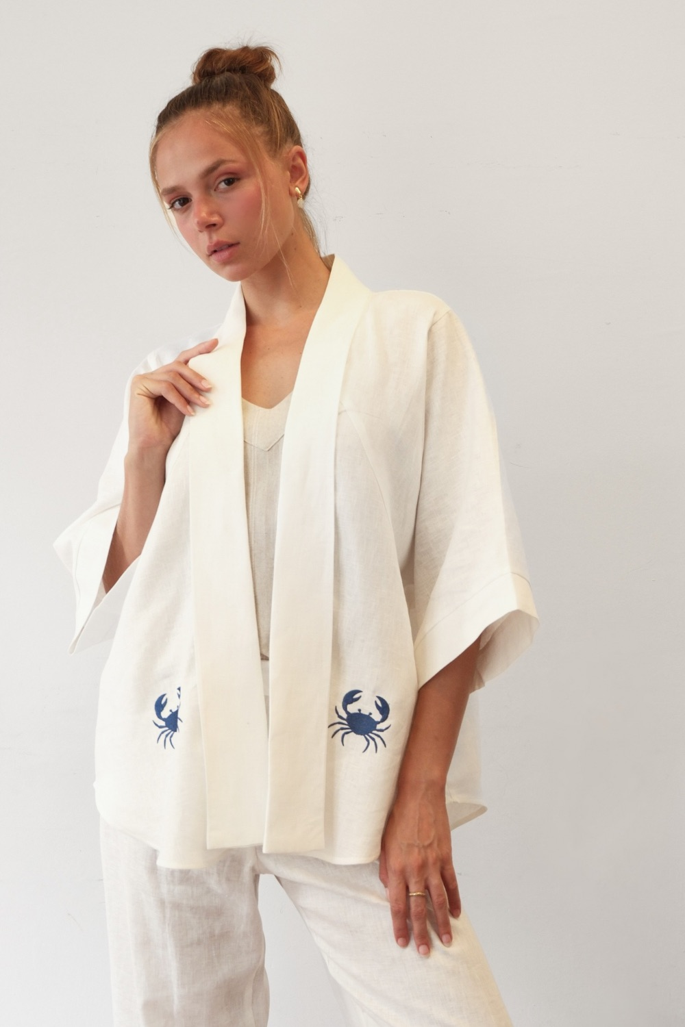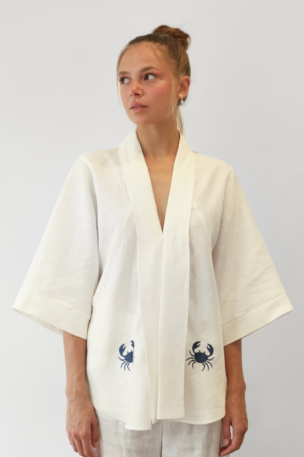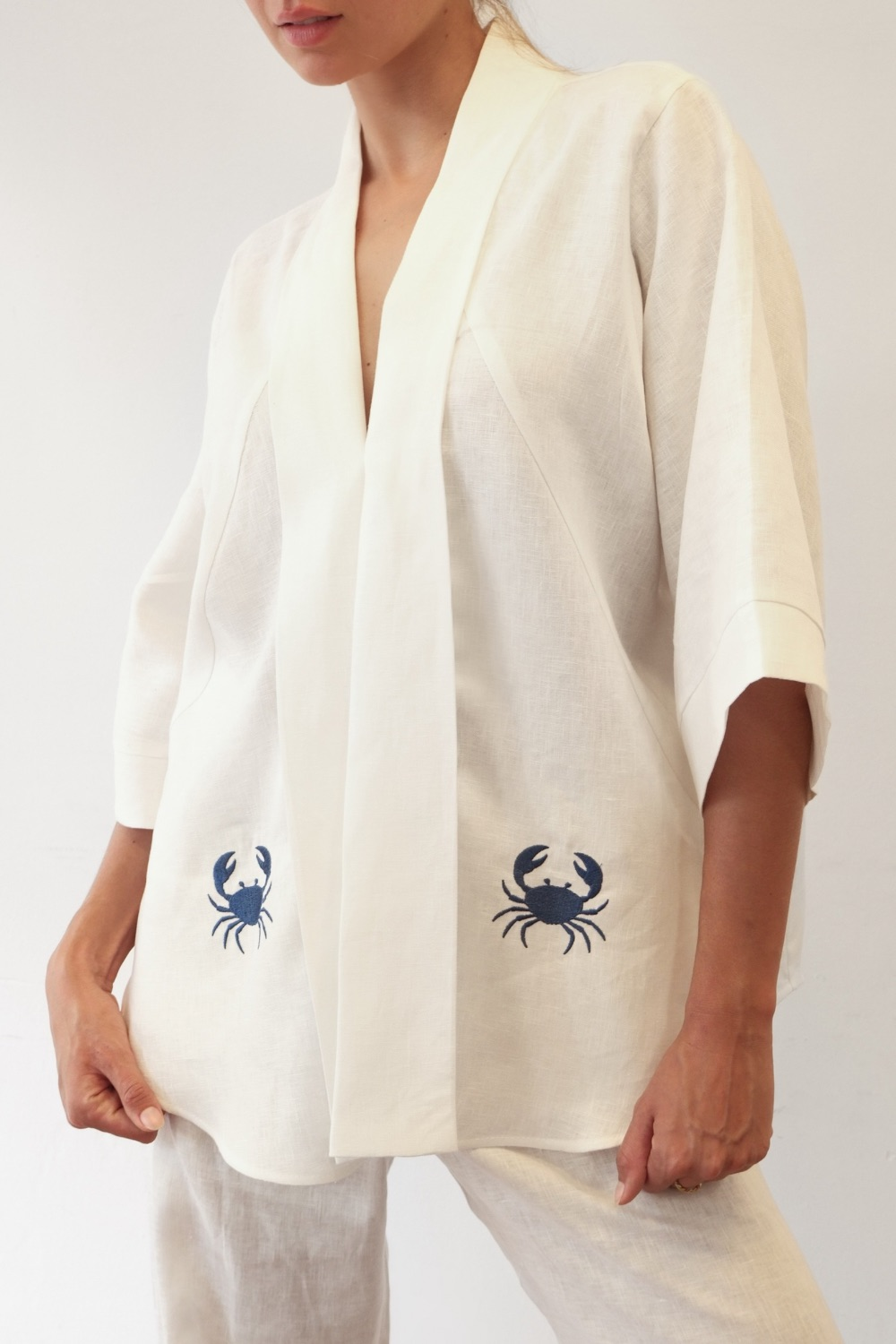 Quimono de linho puro bordado com caranguejos azuis