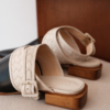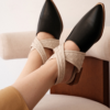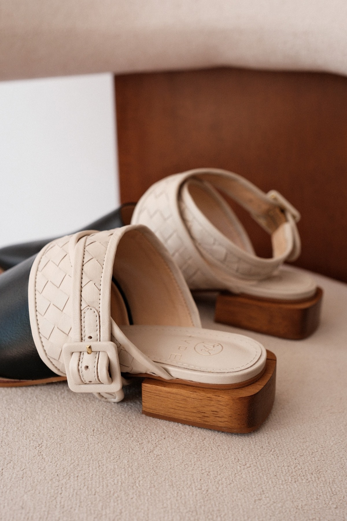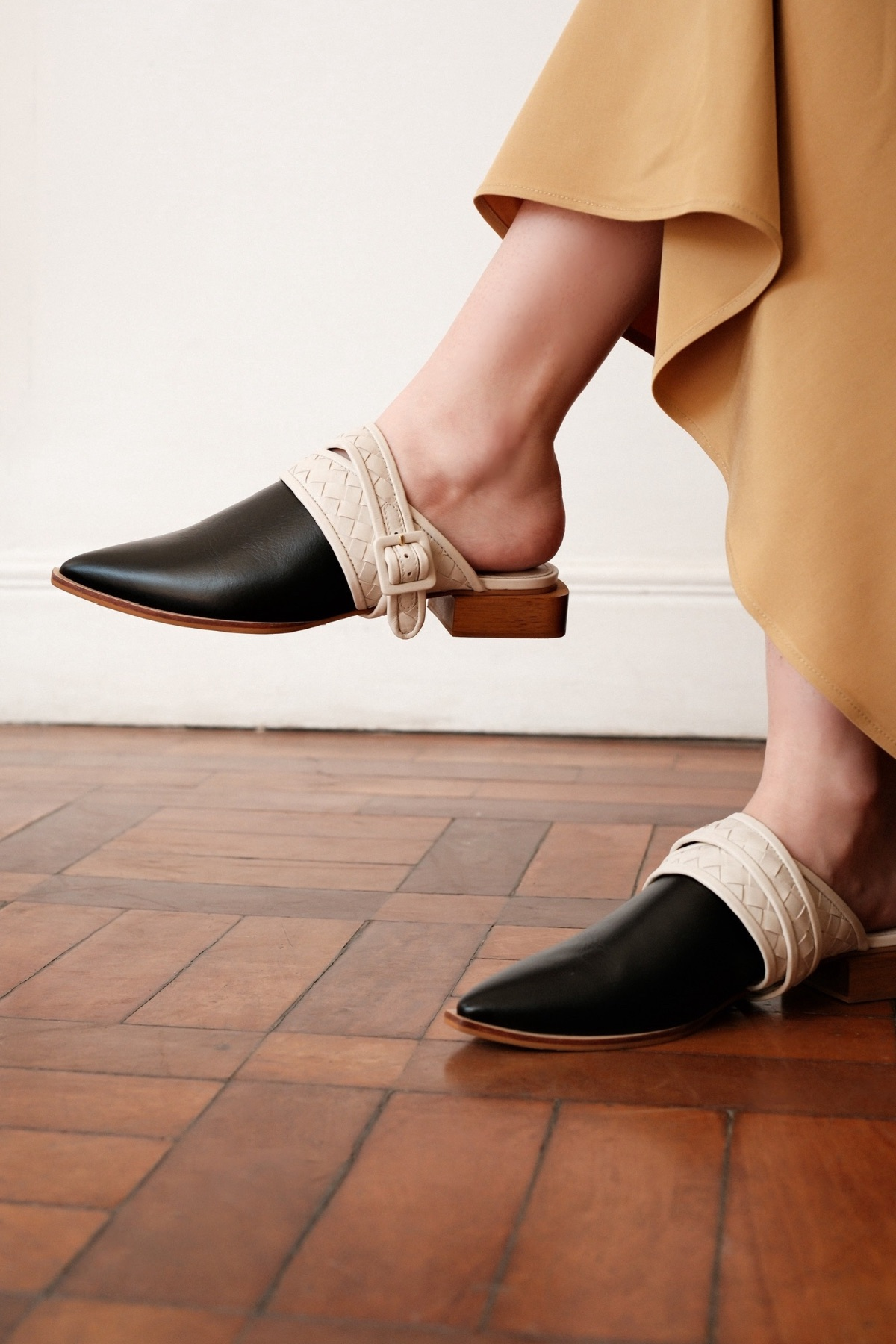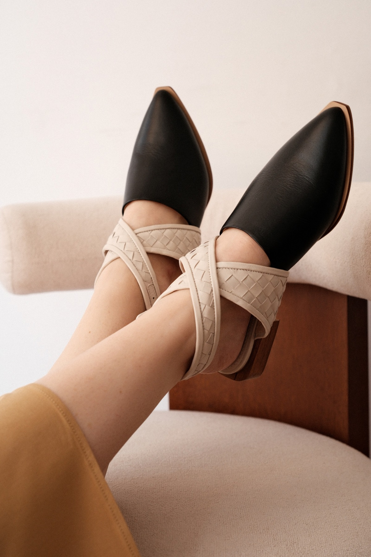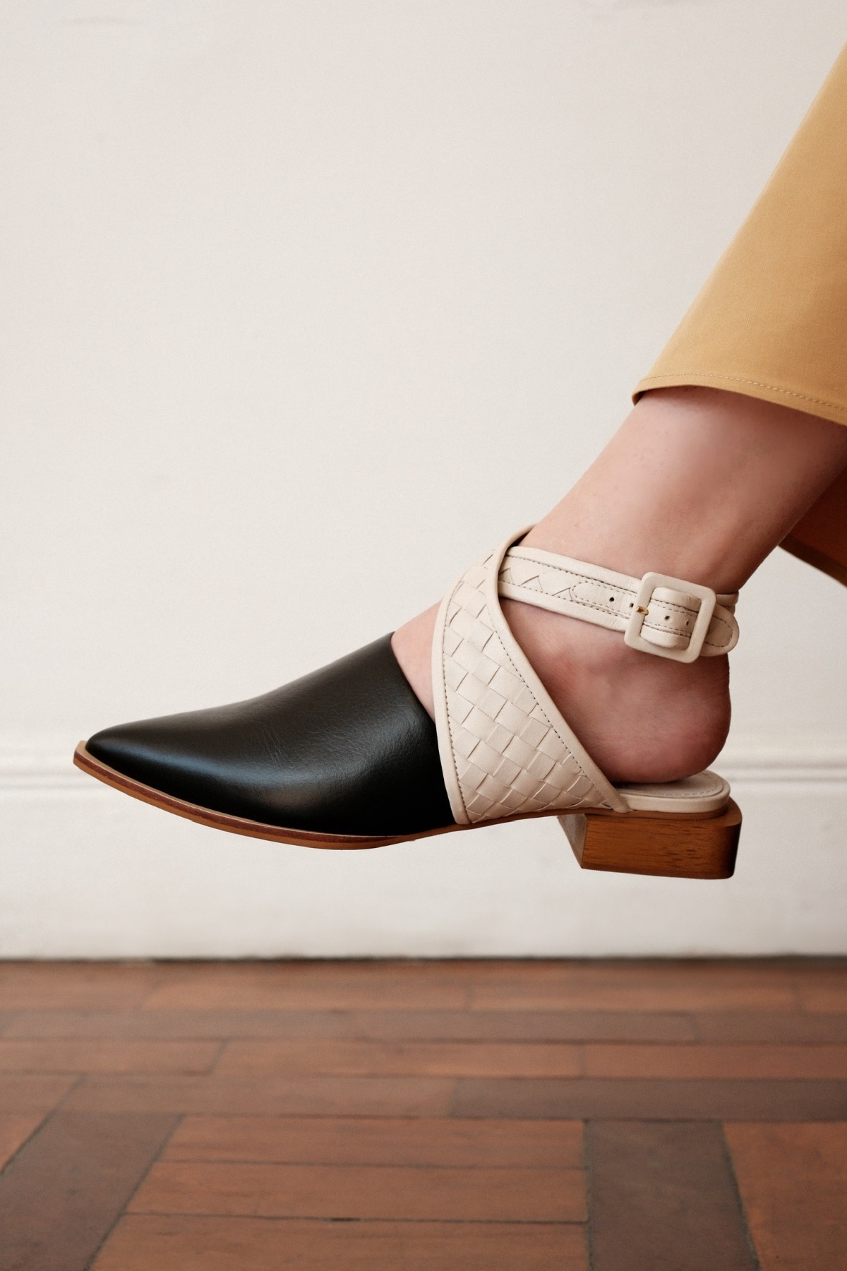 Sapato com salto quadrado de 2cm em madeira, frente de bico fino em couro preto liso e tira em tressê off white.
