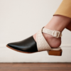 Sapato com salto quadrado de 2cm em madeira, frente de bico fino em couro preto liso e tira em tressê off white.