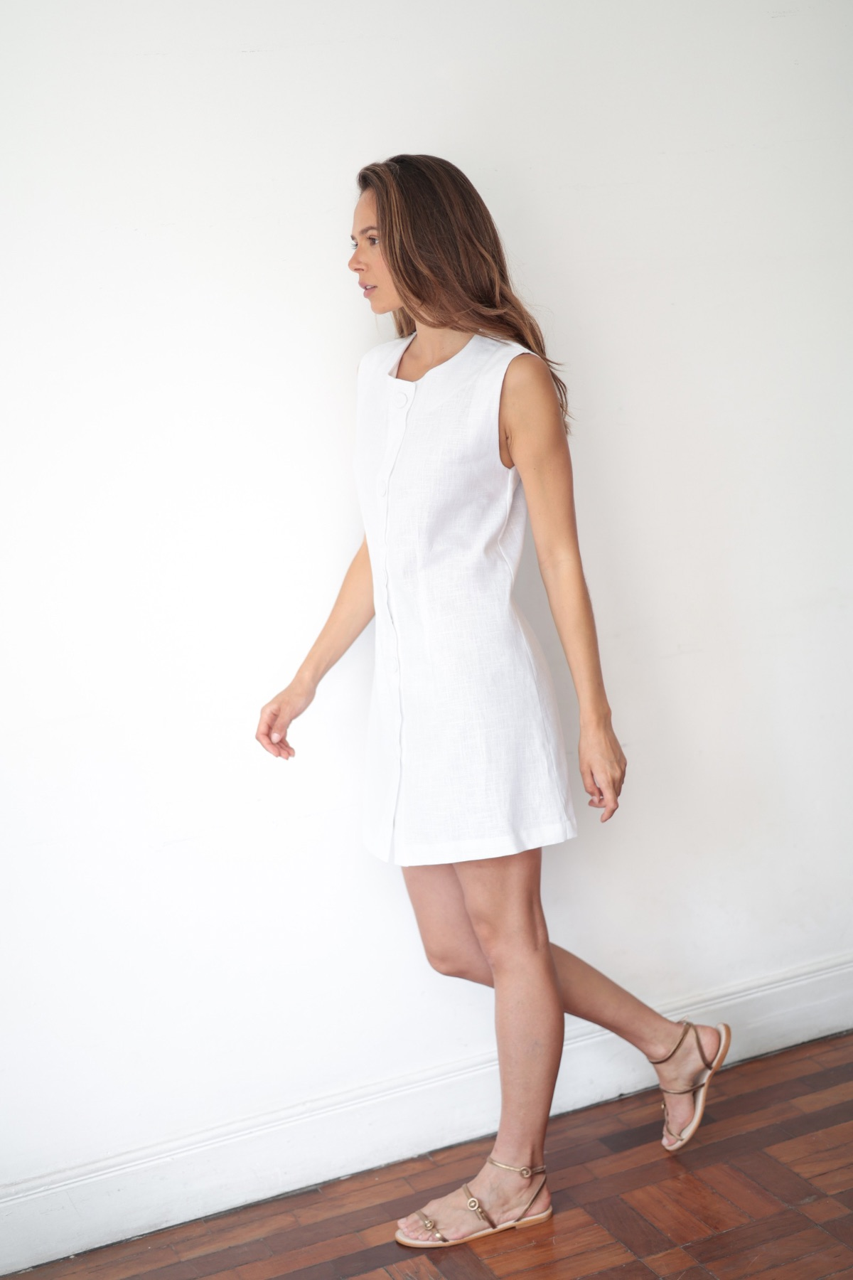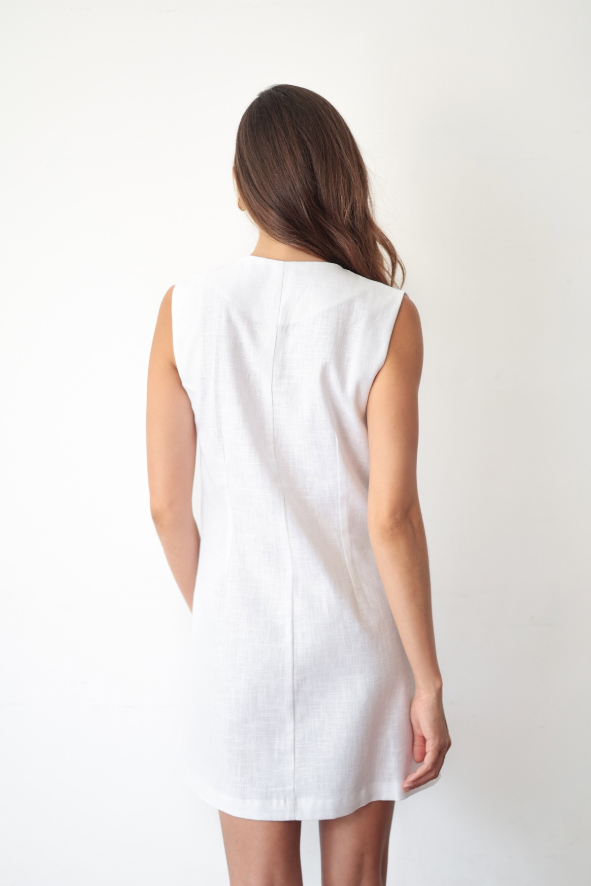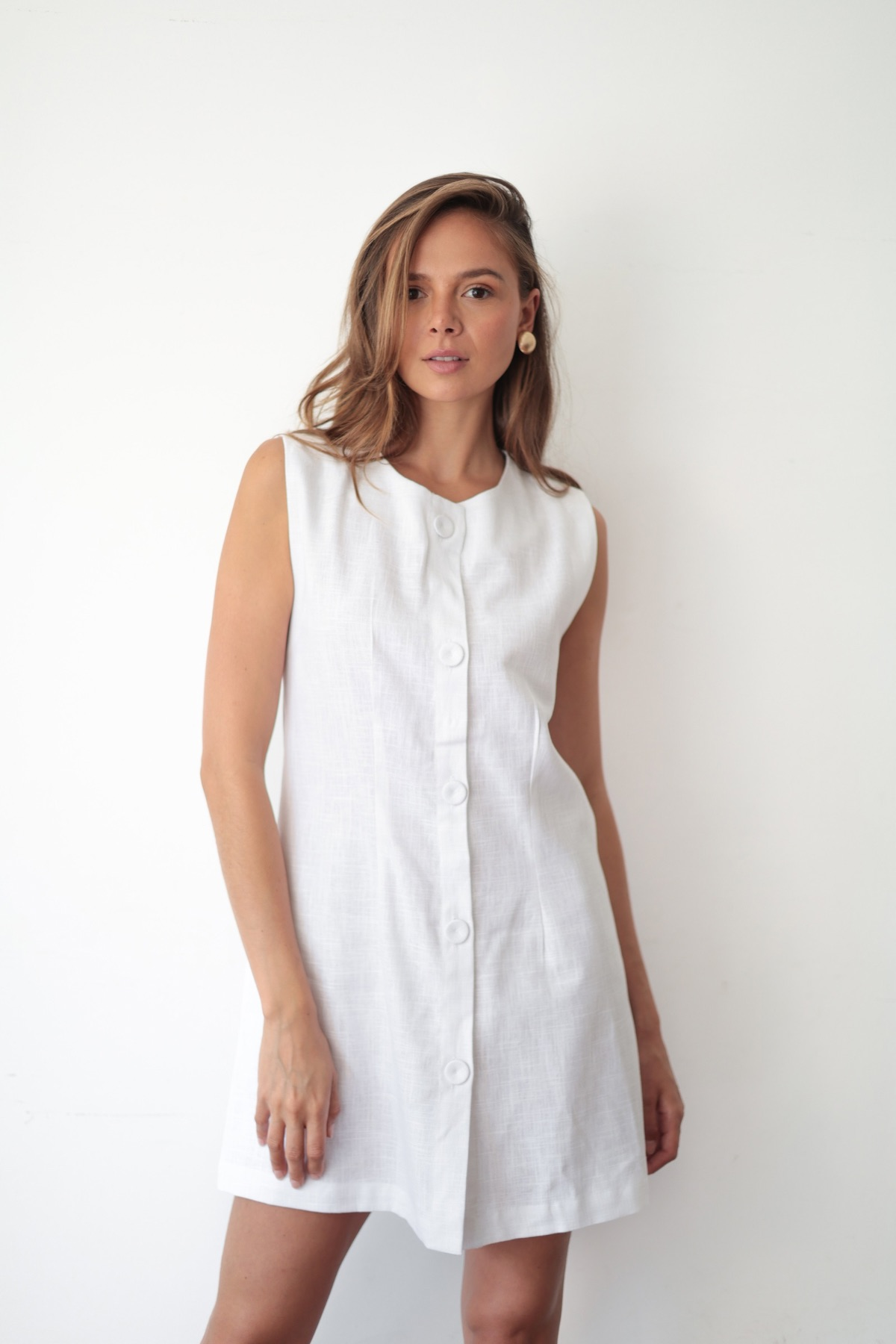 Vestido estruturado, modelagem com quatro pence e fechamento frontal por cinco botões